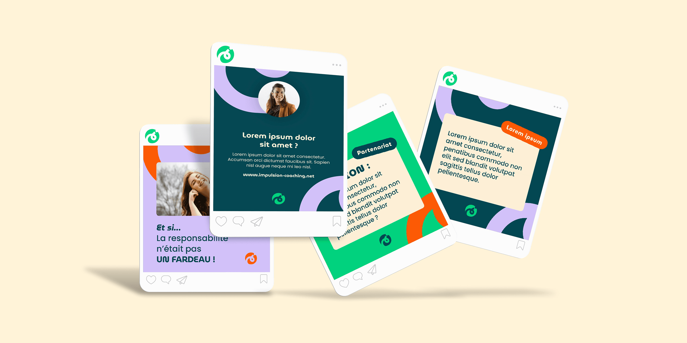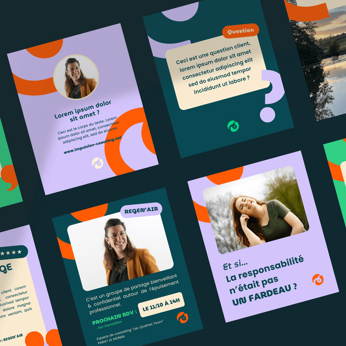Les formes courbes deviennent un élément central : elles symbolisent le cheminement, les transitions et le mouvement intérieur. Elles habillent les visuels, rythment les contenus et apportent de la personnalité sur chaque support.